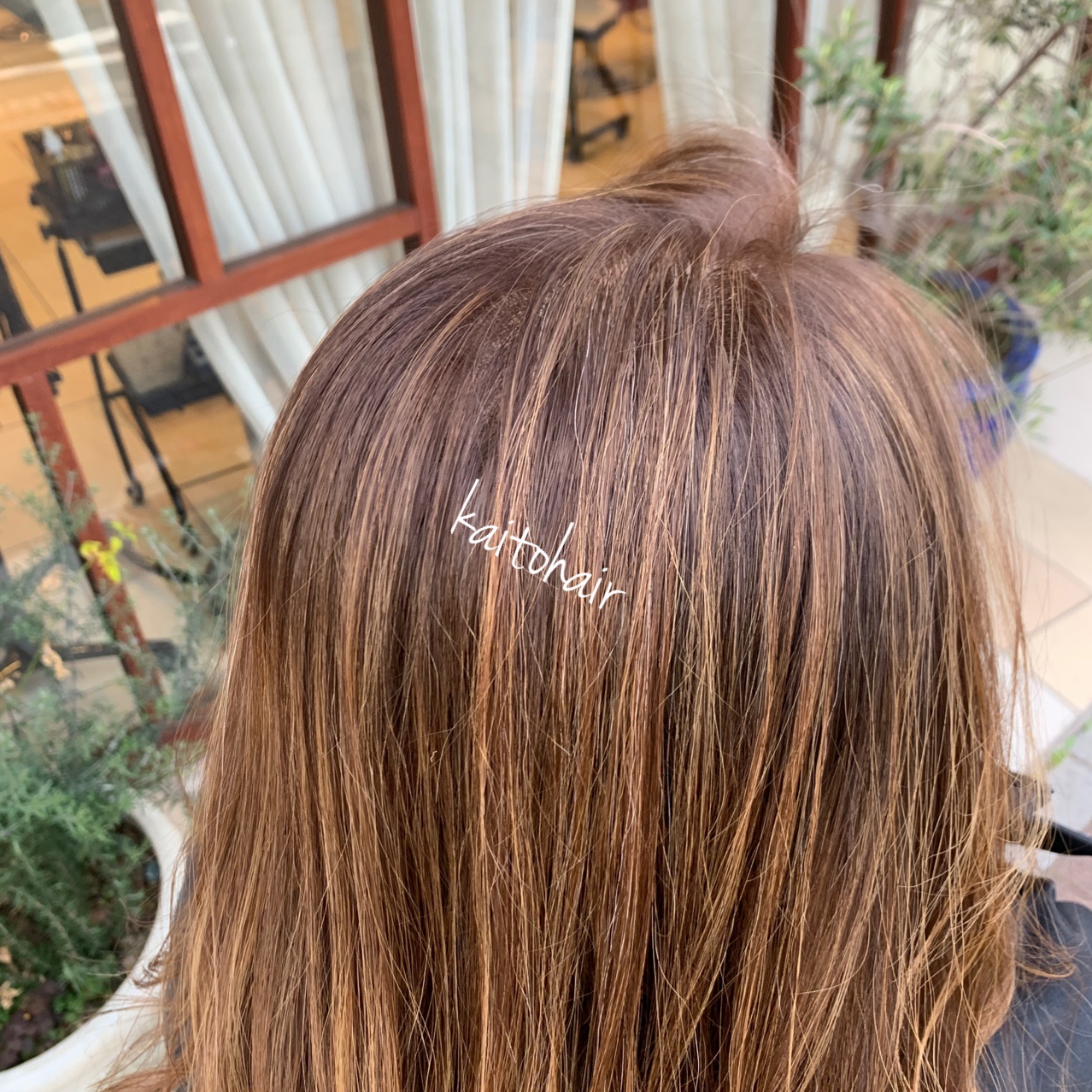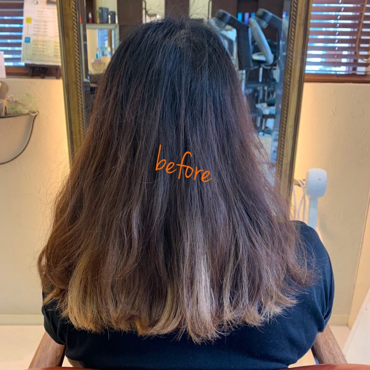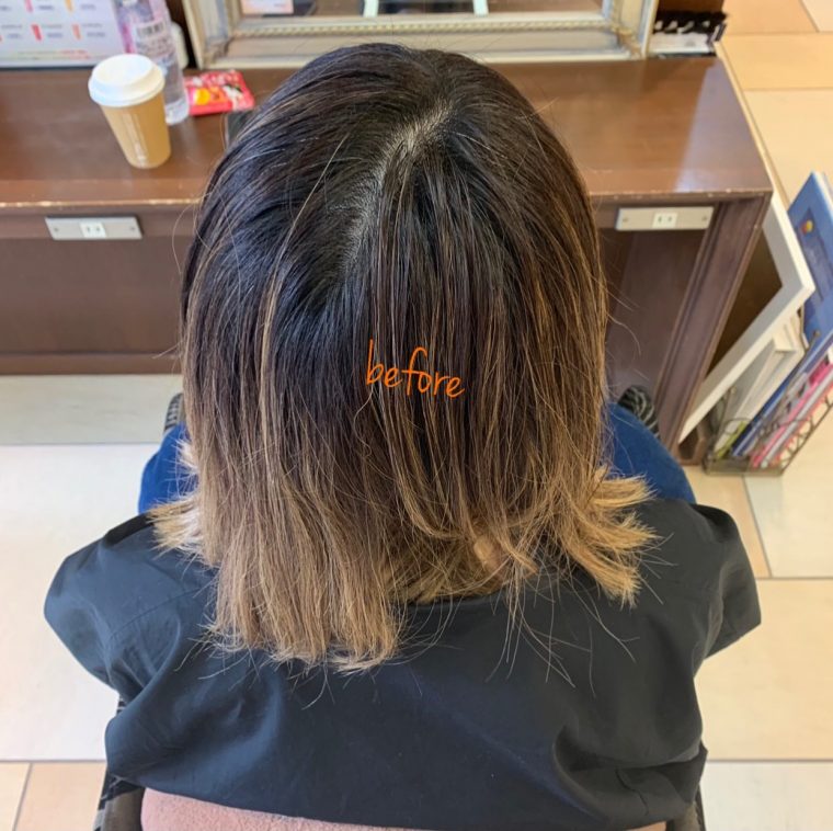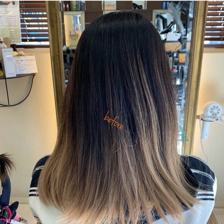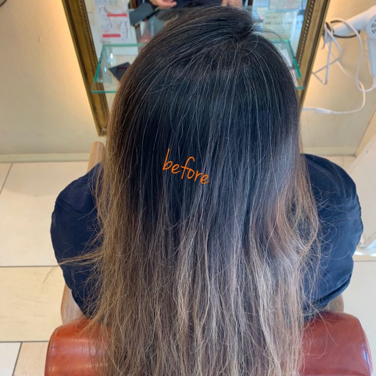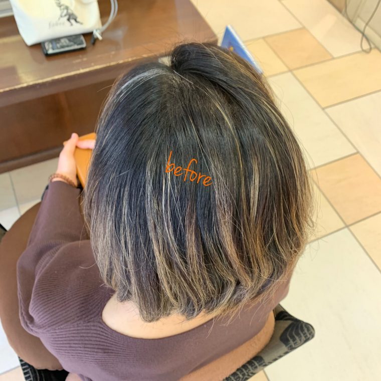 ブリーチで黒く濁った白髪染めの染料を落としていくので、何回か白髪ぼかしハイライトを繰り返していくうちに白髪染め部分が減り、透明感あるカラーが楽しめるようになります!!