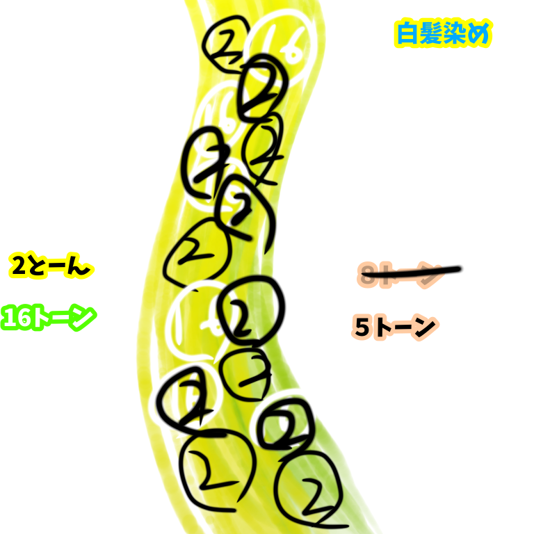 6トーン以下くらいの濃さのカラーでないと白髪には色が入らないわけです!!