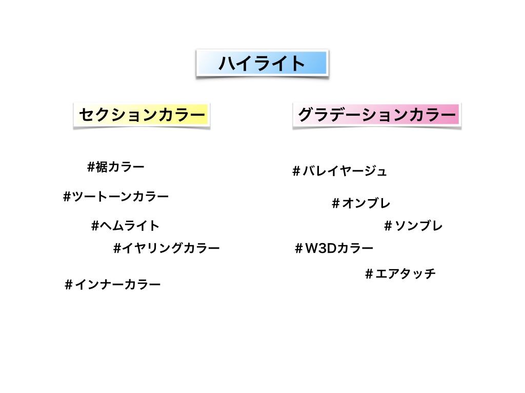 ハイライトってのは陰影をつけたデザイン全般の大カテゴリーの事でその中の陰影の付け方の種類の中カテゴリーがセクションカラーとグラデーションカラー!!
