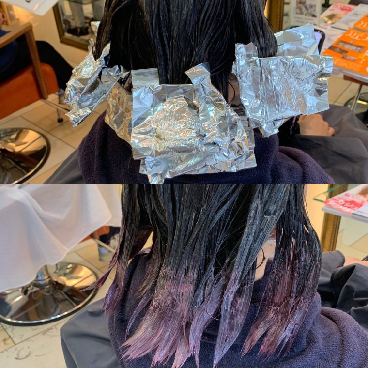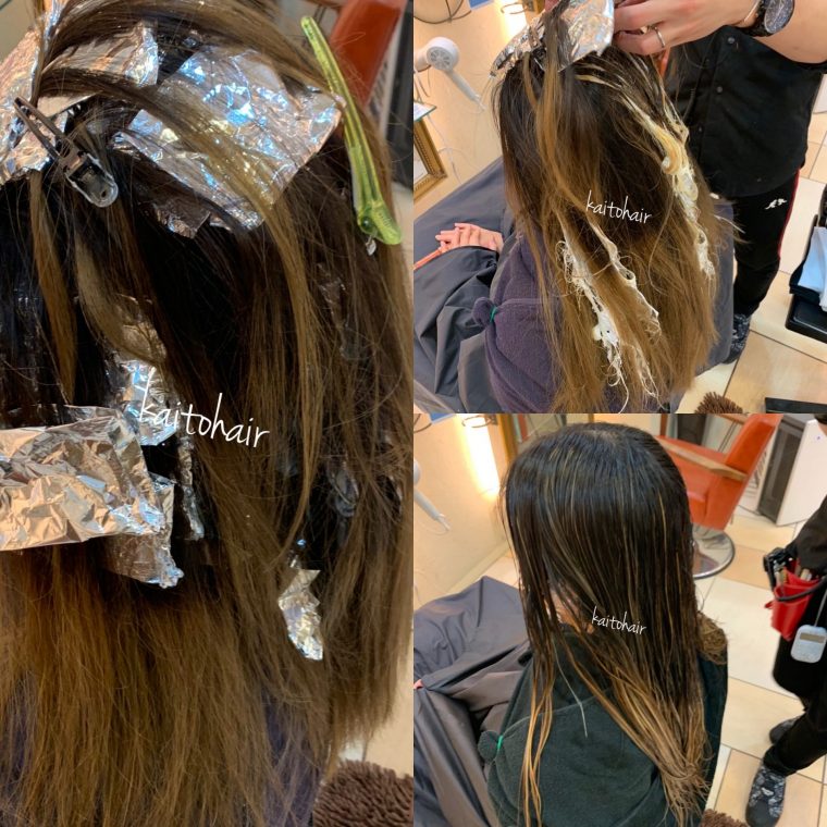 1.で書いたように外国人の髪が経過的ダメージで毛先に行くに従ってグラデーションになっていくイメージなので、ハイライトの量もグラデーション状に多く増やします!!