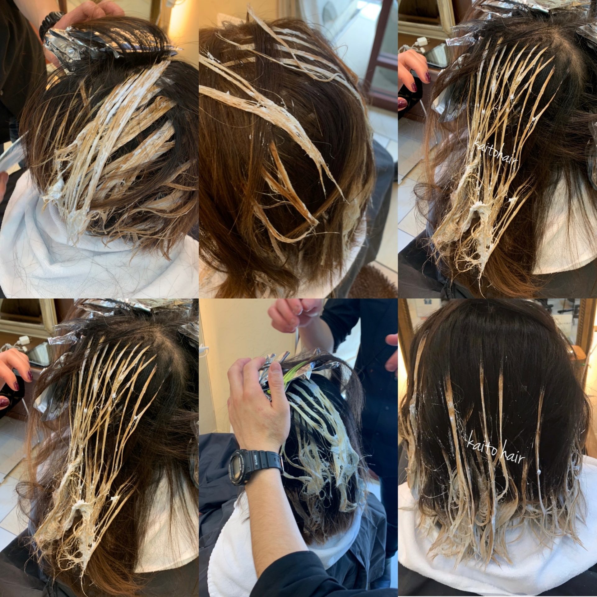 ・中間から毛先に市販の白髪染めが重なるとどんどん暗くなっていくから。