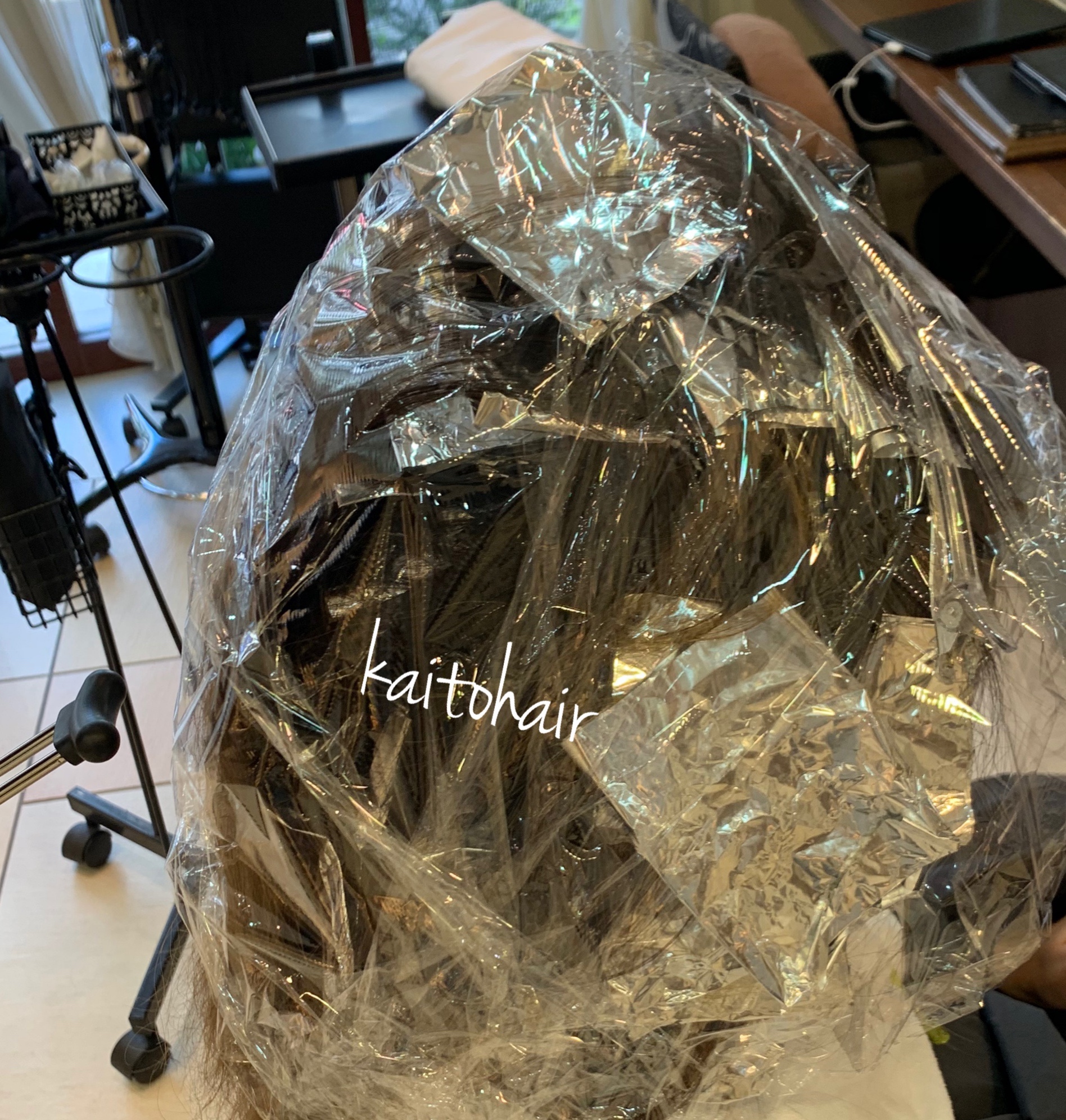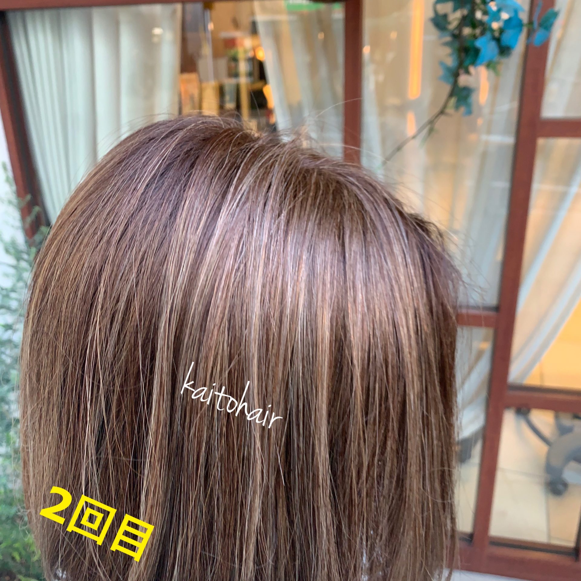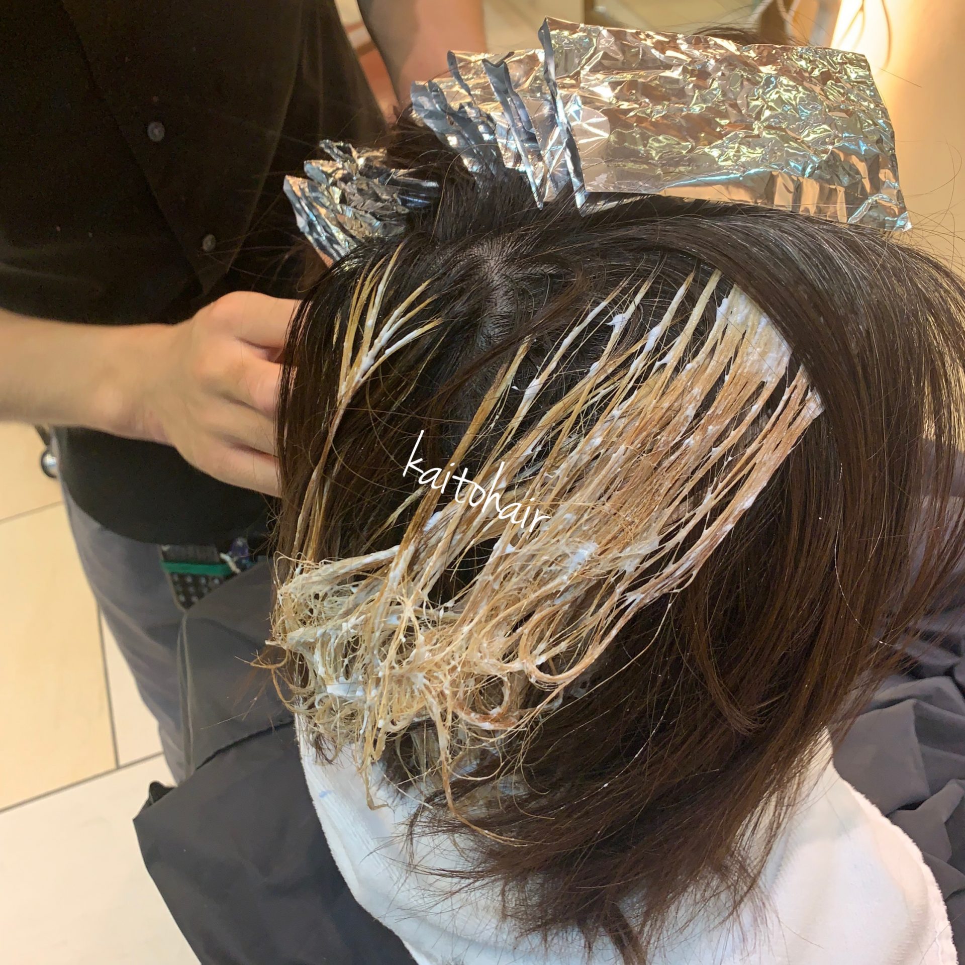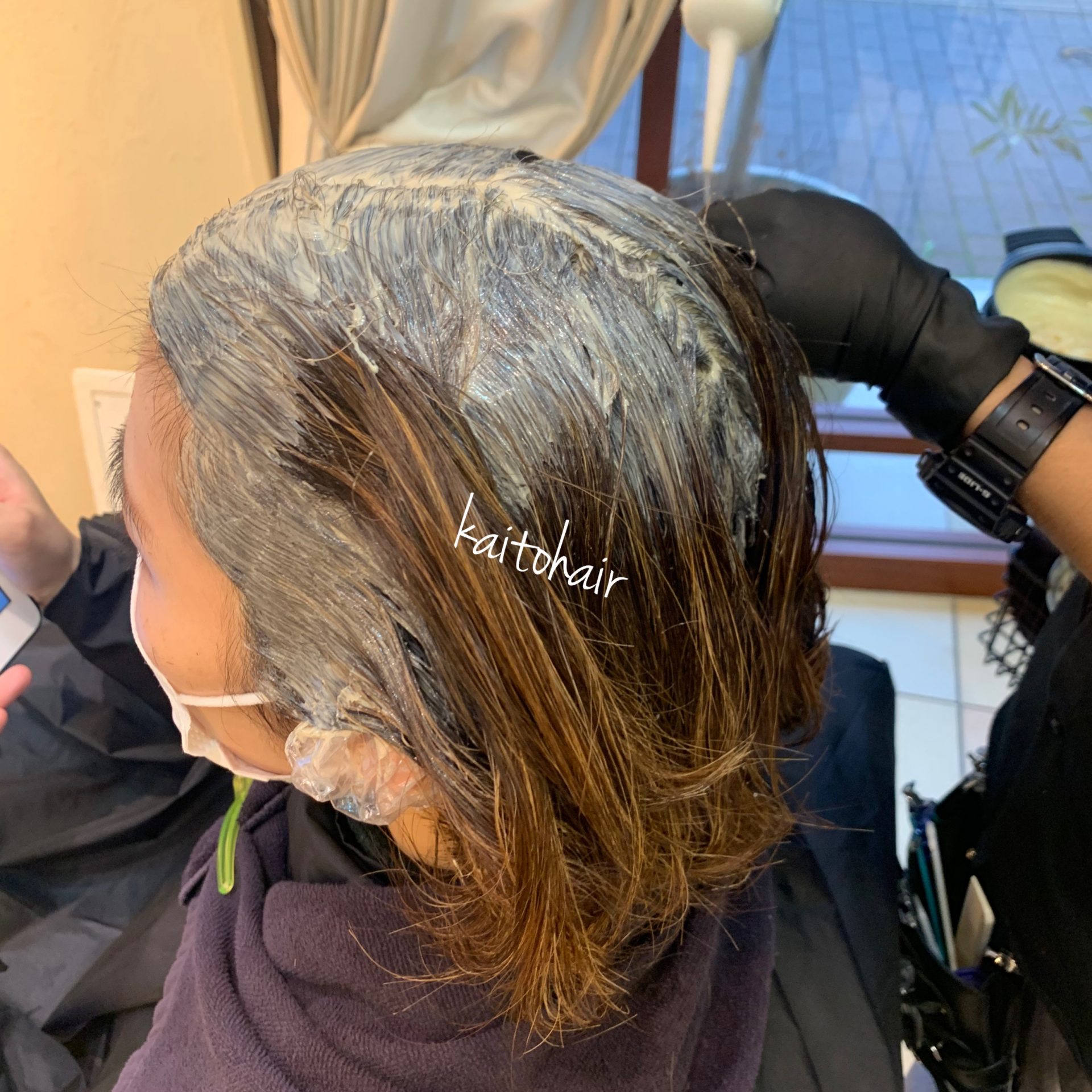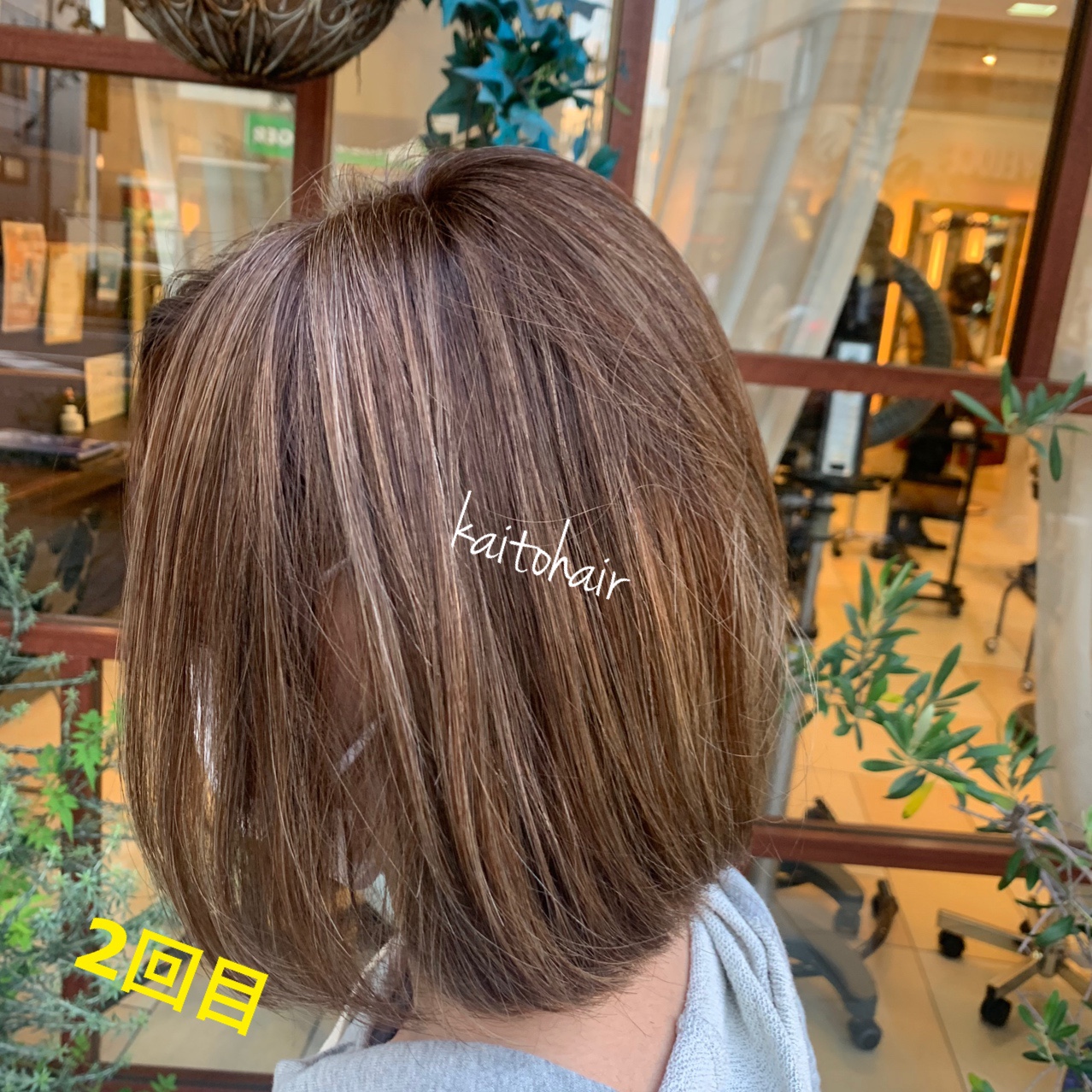 ブリーチによるハイライトアプローチ第2回目の目的としては1回目でとれきれなかった中間から毛先の白髪染めによる残留をとるのと根元のグラデーション感の強調が目的です!!