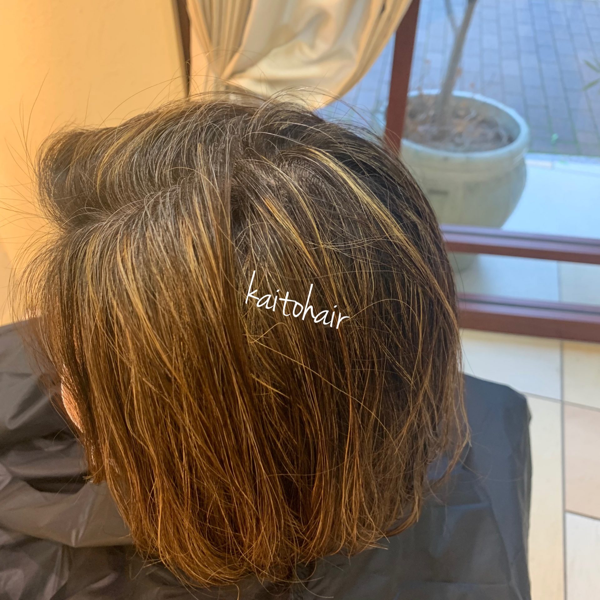 白髪は染めずに、ハイライトで逆グラデーションになったベースを通常のグラデーションになるような調合で染めます!!